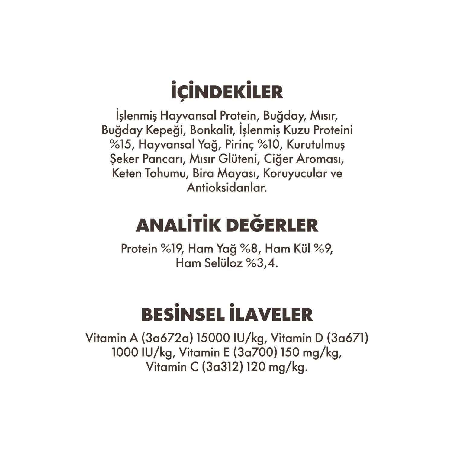 İçindekiler İşlenmiş Hayvansal Protein, Buğday, Mısır, Hayvansal Yağlar, Ciğer Aroması, Pirinç, Tuz, Keten tohumu, Kuru Bira Mayas Mamanın Analizi; Protein % 20,00, ham yağ % 9,00, ham kül % 8,00, ham selüloz % 4,00, kalsiyum, fosfor, sodyum, iyot, çinko, bakır, potasyum klorür, demir, selenyum, vitamin A 15.000 IU/kg, vitamin D 1.000 IU/kg, vitamin E 100 mg/kg, vitamin C 100 mg/kg, Vit. B1 - B2 -B3 (Niasin) -B6 - B12 - B7 (Biotin) - B9 (Folik Asid) Vit. K, Kolin, Kalsiyum Pantotetan.